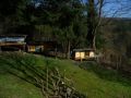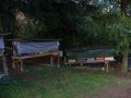 Ein Blick in meinen Bienenstand. Links neben dem Wachsschmelzer ein großer Edelkastanienbaum Im Vordergrund stehen einige Bienenbäume. Dieser Baum, dessen Heimat in Fernost liegt, hat seine Hauptblütezeit bis weit in den September hinein und bietet somit eine gute Bienentracht in dieser ansonsten eher trachtschwachen Zeit.