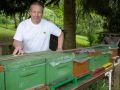 Ende April konnten bei einigen Völkern ein zweiter Honigraum gegeben werden. Die Bienen haben schon damit angefangen, den Honig zu verdeckeln. Bei der in den nächsten Tagen erwarteten Witterung werden sie damit weiter machen. Auf den beiden Bildern links sieht man wie sie verdeckeln. Rechts Völker mit insgesamt 4 Zargen, in den beiden oberen Zargen sammeln die Bienen Honig. Das zweite Bild von rechts zeigt Brut (braun, verdeckelt), Pollen (gelb, ungefähr zur Hälfte gefüllt) und unverdeckelten Honig (glänzend). Unten mit gelbem Punkt sieht man die Königin.