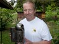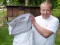 Links: Die Ableger. Ableger sind junge Bienenvölker, die über das Jahr zu vollwertigen Völkern heranreifen und im Folgejahr als Wirtschaftsvölker (hoffentlich) Honig geben. Mitte: Der Smoker. Damit erzeugt man Rauch, der die Bienen ablenkt. Man simuliert damit einen Waldbrand und regt damit die Bienen an, ihre Honigmägen zu füllen. Währenddessen kann man in Ruhe am Volk arbeiten. Rechts: Der Imkerblouson. Weil man nie so genau weiß, ob man die Bienen mit Rauch gut genug in Schach hält, zieht man sich einen Imkerblouson über, um vor unliebsamen Stichen geschützt zu sein.