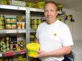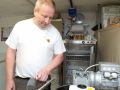 Links: Im Hintergrund ein Wärmeschrank um Honig schonend zu verflüssigen. Das ist manchmal nötig, sonst kann man ihn nicht abfüllen. Vorne rechts der Motor meines Rührwerkes. Manche Honige werden vor dem Abfüllen gerührt, um eine besonders angenehme feinsteife Konsistenz zu erreichen. Mitte: Honig abgefüllt in einen kleinen Honigeimer. Rechts: Honig abgefüllt im Glas.